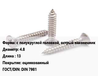 Саморез с полукруглой головкой, острый наконечник D=4.8 L=13 оцинкованный ГОСТ: DIN 7981