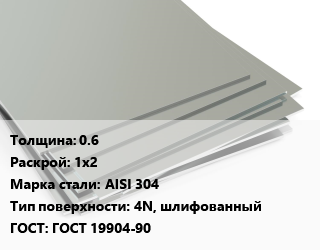 Лист нержавеющий 0.6 1х2 Сталь: AISI 304 Тип:4N, шлифованный ГОСТ 19904-90