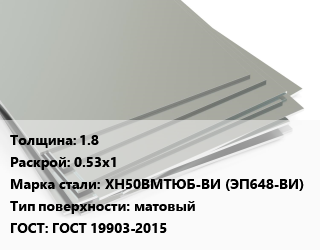 Лист нержавеющий 1.8 0.53х1 Сталь: ХН50ВМТЮБ-ВИ (ЭП648-ВИ) Тип:матовый ГОСТ 19903-2015