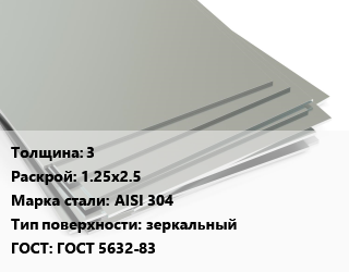 Лист нержавеющий 3 1.25х2.5 Сталь: AISI 304 Тип:зеркальный ГОСТ 5632-83